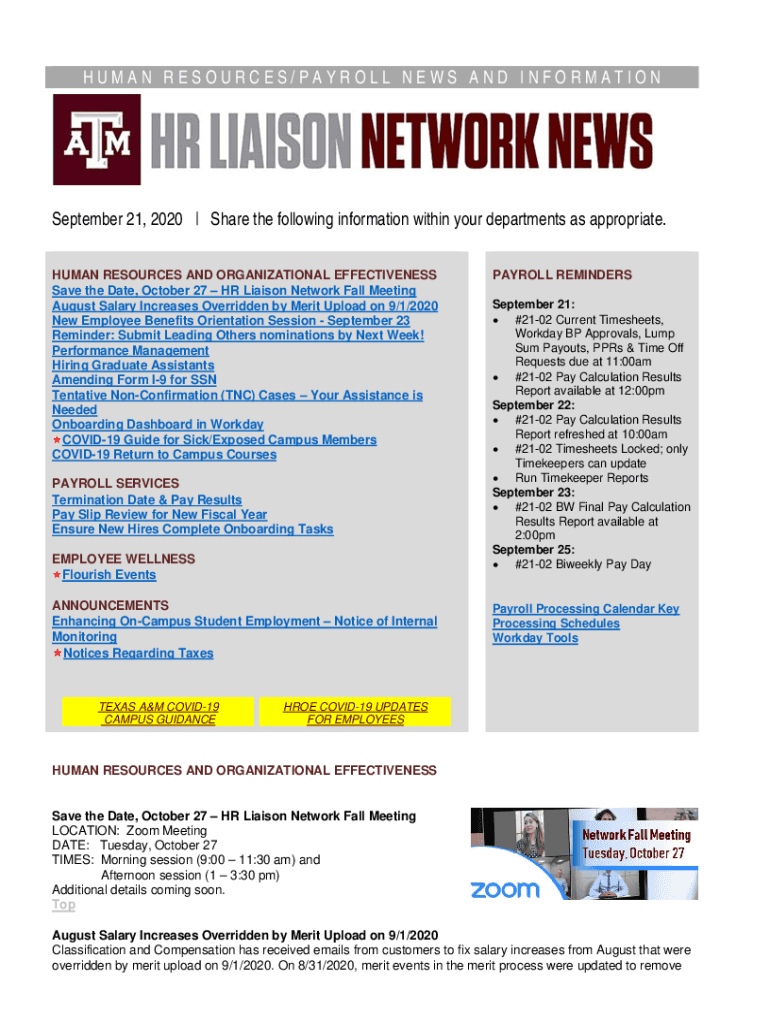 HUMAN RESOURCES/PAYROLL NEWS AND INFORMATION September 21, 2020 | Share the following information within your departments as appropriate. HUMAN RESOURCES AND ORGANIZATIONAL EFFECTIVENESS Save the