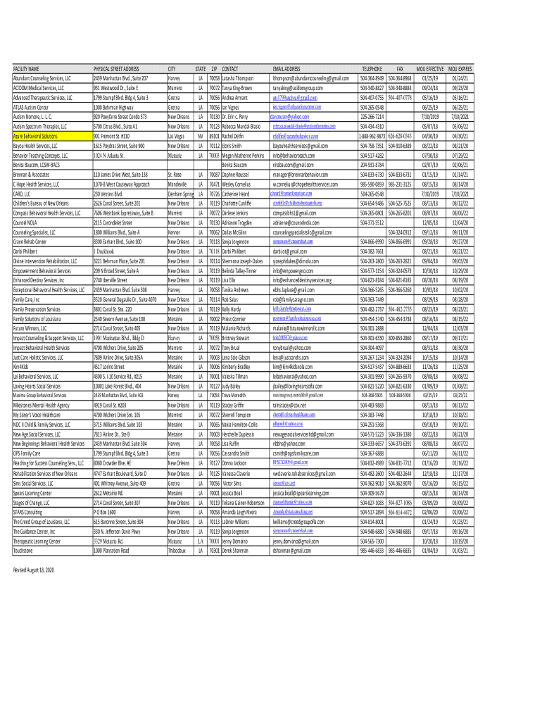 FACILITY NAME Abundant Counseling Services, LLC ACI DOM Medical Services, LLC Advanced Therapeutic Services, LLC ATLAS Autism Center Autism No more, L. L. C. Autism Spectrum Therapies, LLC Azure Behavioral