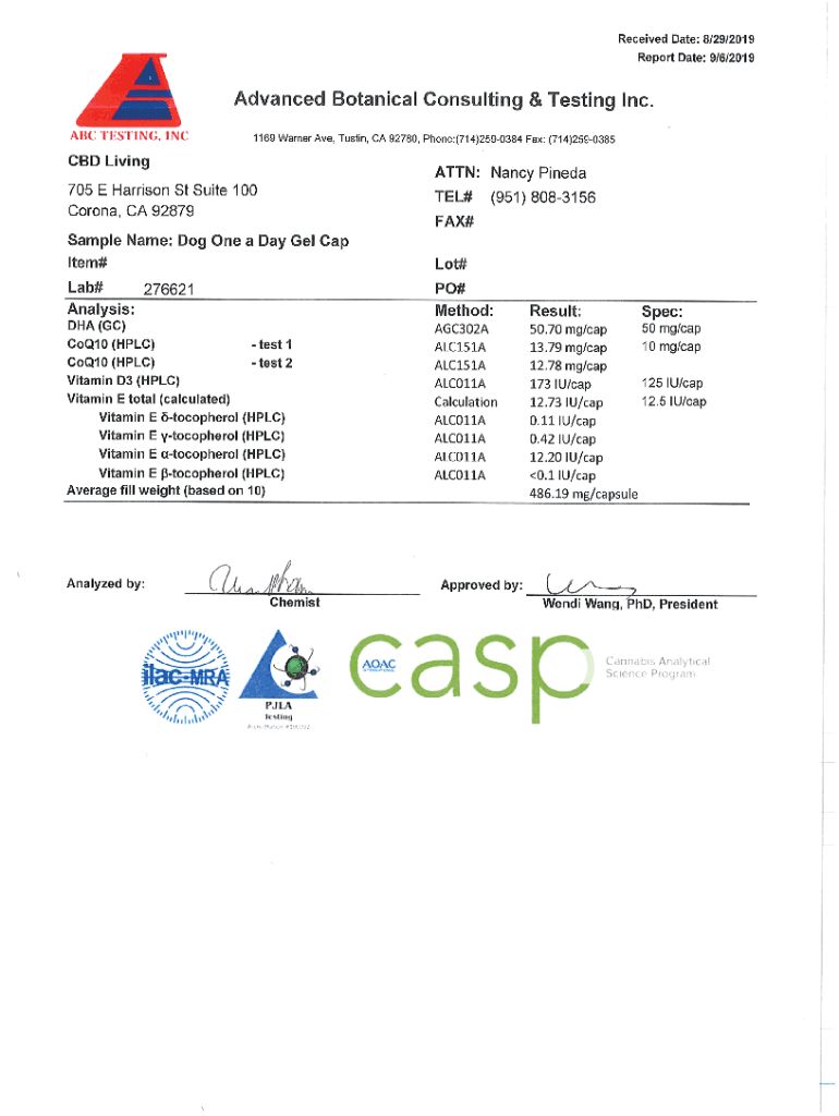 FOR R&D USECannalysis Headquarters 1801 Carnegie Ave Santa Ana, CA 92705 C80000012LICCERTIFICATE OF ANALYSIS SAMPLE INFORMATION Sample Name: Sample Matrix: Batch I'd: Received: Servings Per Pkg:Dog