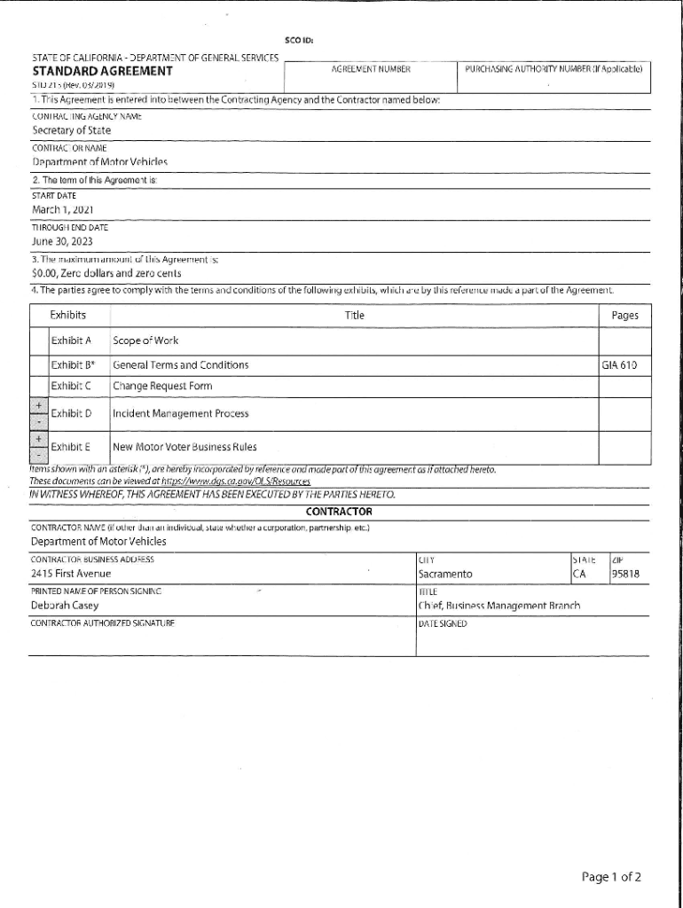 SCO IO:STATE OF CALIFORNIA DEPARTMENT OF GENERAL SERVICES, ,,AGREEMENT NUMBERSTANDARD AGREEMENTPURCHASING AUTHORITY NUMBER (If Applicable)STD 213 (Rev. 03/2019)1. This Agreement is entered into between