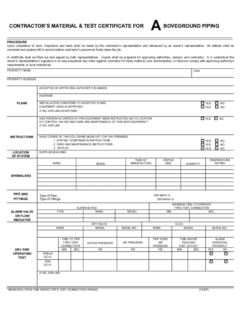 CONTRACTORS MATERIAL & TEST CERTIFICATE FORABOVEGROUND PIPINGPROCEDURE Upon completion of work, inspection and tests shall be made by the contractors representative and witnessed by an owners representative.