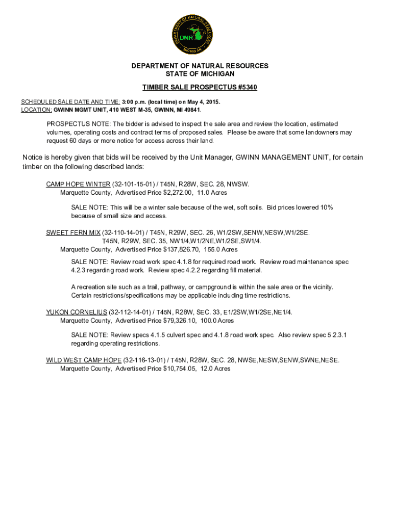 DEPARTMENT OF NATURAL RESOURCES STATE OF MICHIGAN TIMBER SALE PROSPECTUS #5340 SCHEDULED SALE DATE AND TIME: 3:00 p.m. (local time) on May 4, 2015. LOCATION: GOING MGMT UNIT, 410 WEST M35, GOING,