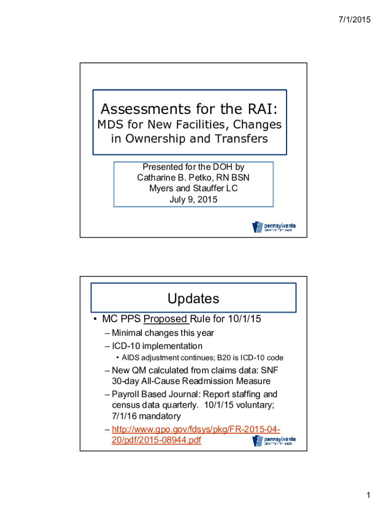 7/1/2015Assessments for the RAI: MDS for New Facilities, Changes in Ownership and Transfers Presented for the DOH by Catherine B. Peter, RN BSN Myers and Stauffer LC July 9, 2015Updates MC PPS Proposed