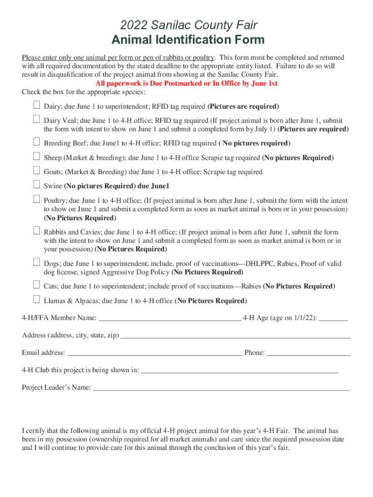 Get the free Animal Identification Form - Sanilac County Youth & 4-H Fair