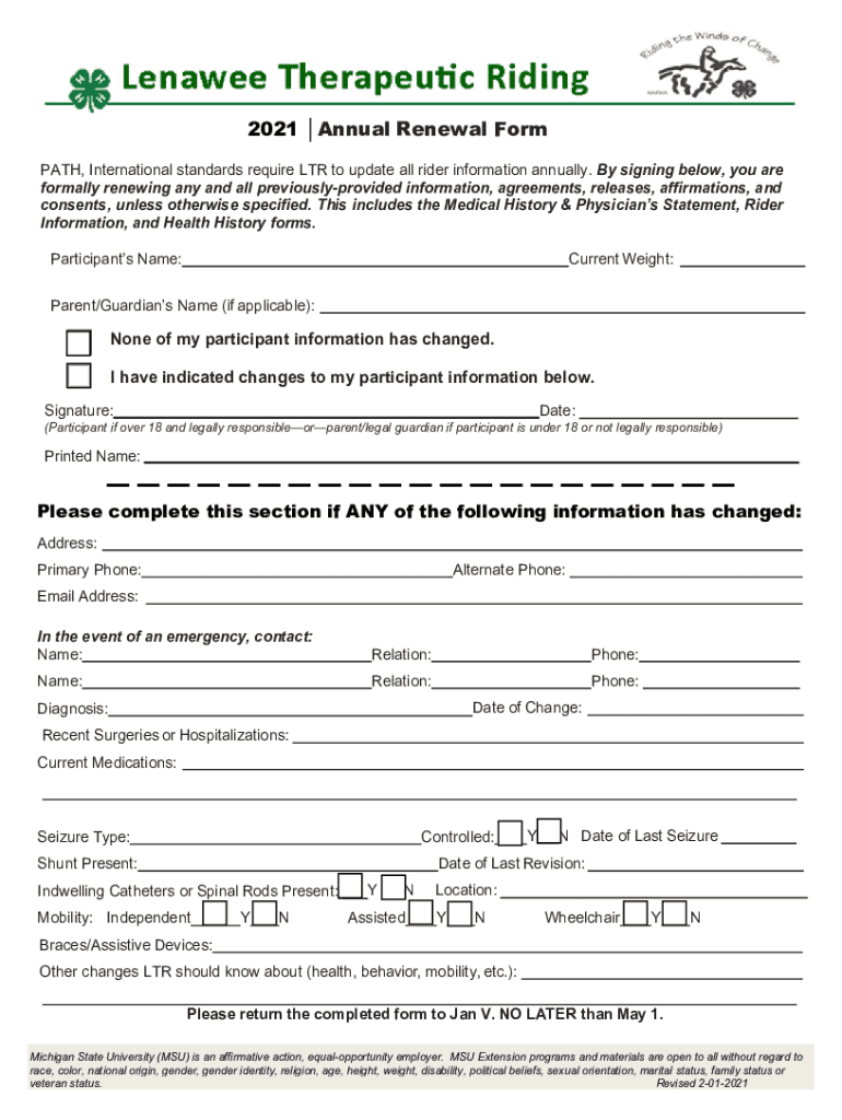 2021 Annual Renewal Form PATH, International standards require LTR to update all rider information annually. By signing below, you are formally renewing any and all previously provided information,
