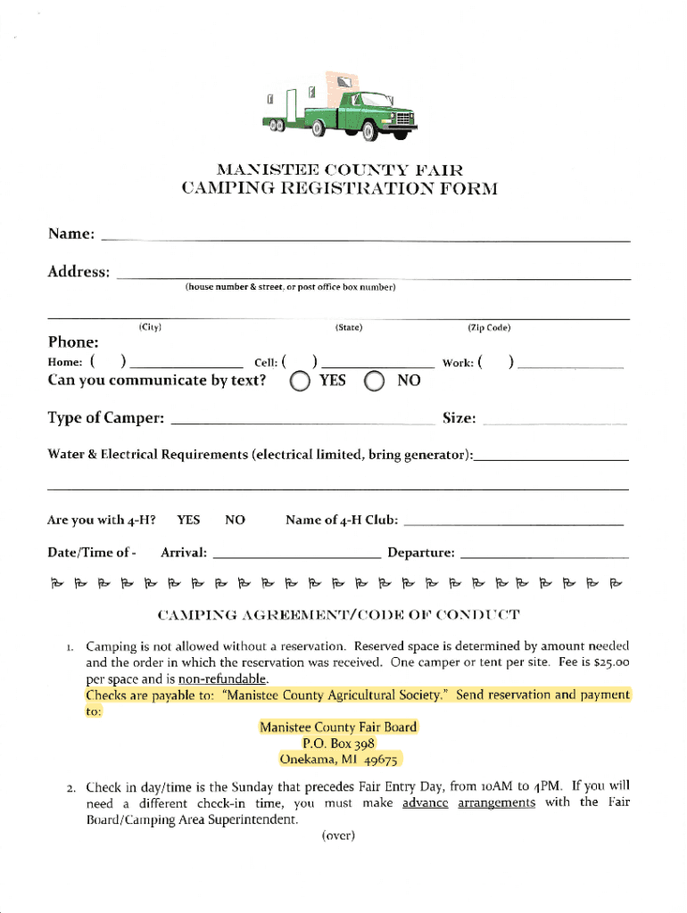 MINISTER COUNTY FAIR CAMPING REGISTRATION FOR IVI Name: Address: (house number & street, or post office box number)(City)(State)(Zip Code)Phone: Home:()cell:(Can you communicate by text?work\'()YES)Type