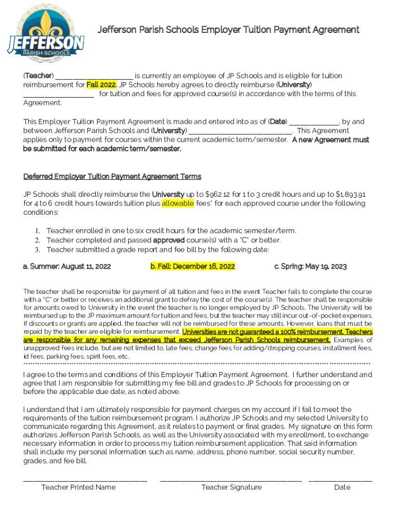 Jefferson Parish Schools Employer Tuition Payment Agreement(Teacher) ___ is currently an employee of JP Schools and is eligible for tuition reimbursement for Fall 2022. JP Schools hereby agrees to