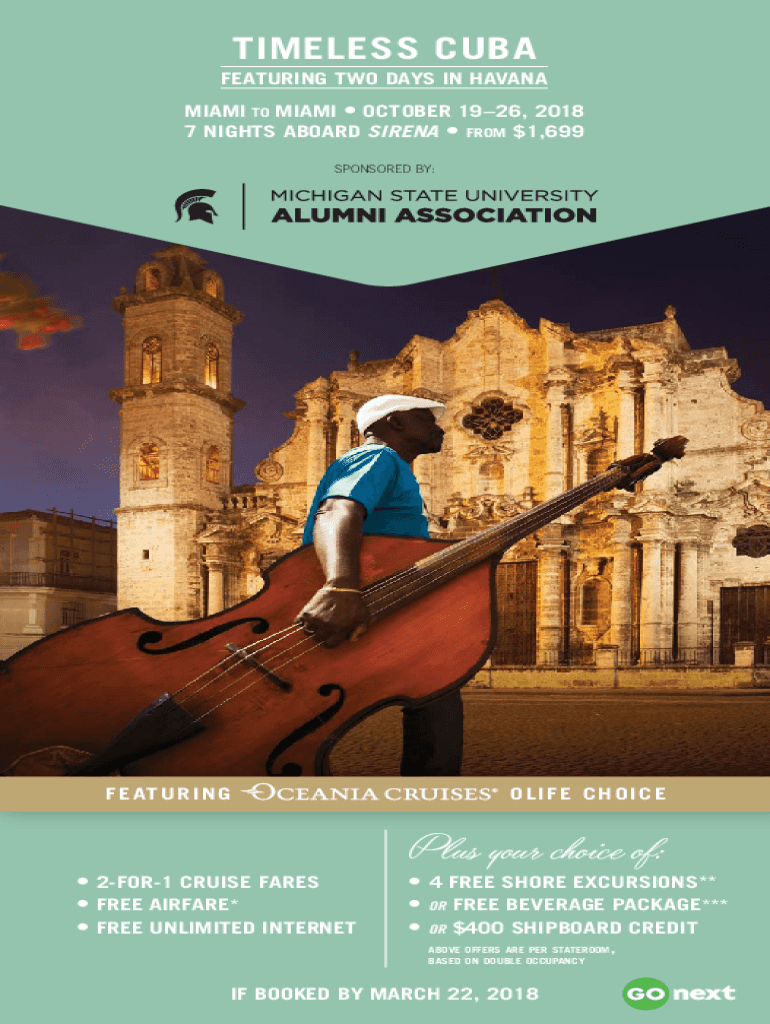 TIMELESS CUBA FEATURING TWO DAYS IN HAVANA MIAMI TO MIAMI OCTOBER 1926, 2018 7 NIGHTS ABOARD SERENA FROM $1,699 SPONSORED BY:FE AT You are I N GO IF E Choices your choice of: 2FOR1 CRUISE FARES FREE