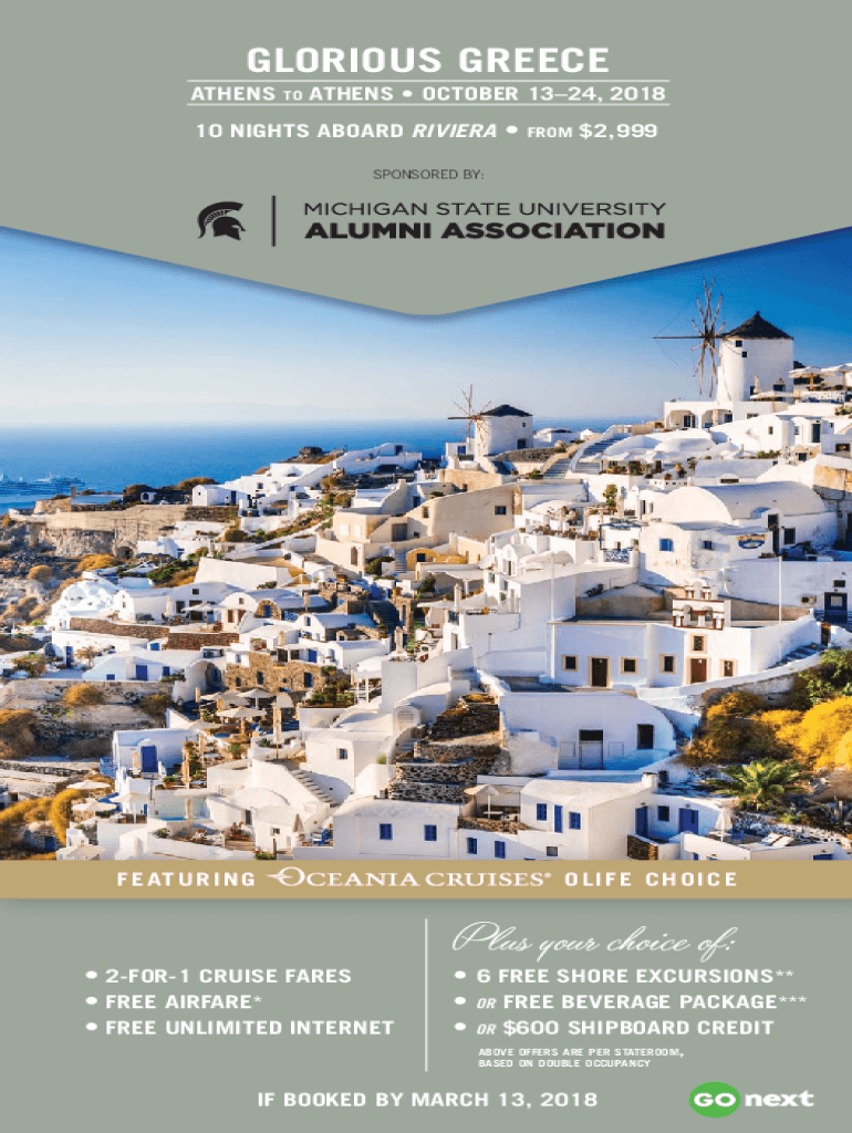GLORIOUS GREECE ATHENS TO ATHENS OCTOBER 1324, 2018 10 NIGHTS ABOARD RIVIERA FROM $2,999 SPONSORED BY:OF IF E CHOICE AT You are I NG Plus your choice of: 2FOR1 CRUISE FARES FREE AIRFARE* FREE UNLIMITED