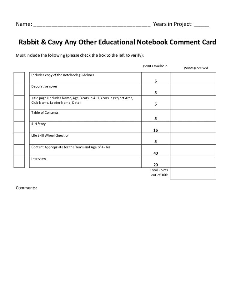 Name: ___ Years in Project: ___Rabbit & Navy Any Other Educational Notebook Comment Card Must include the following (please check the box to the left to verify): Points available Includes copy of