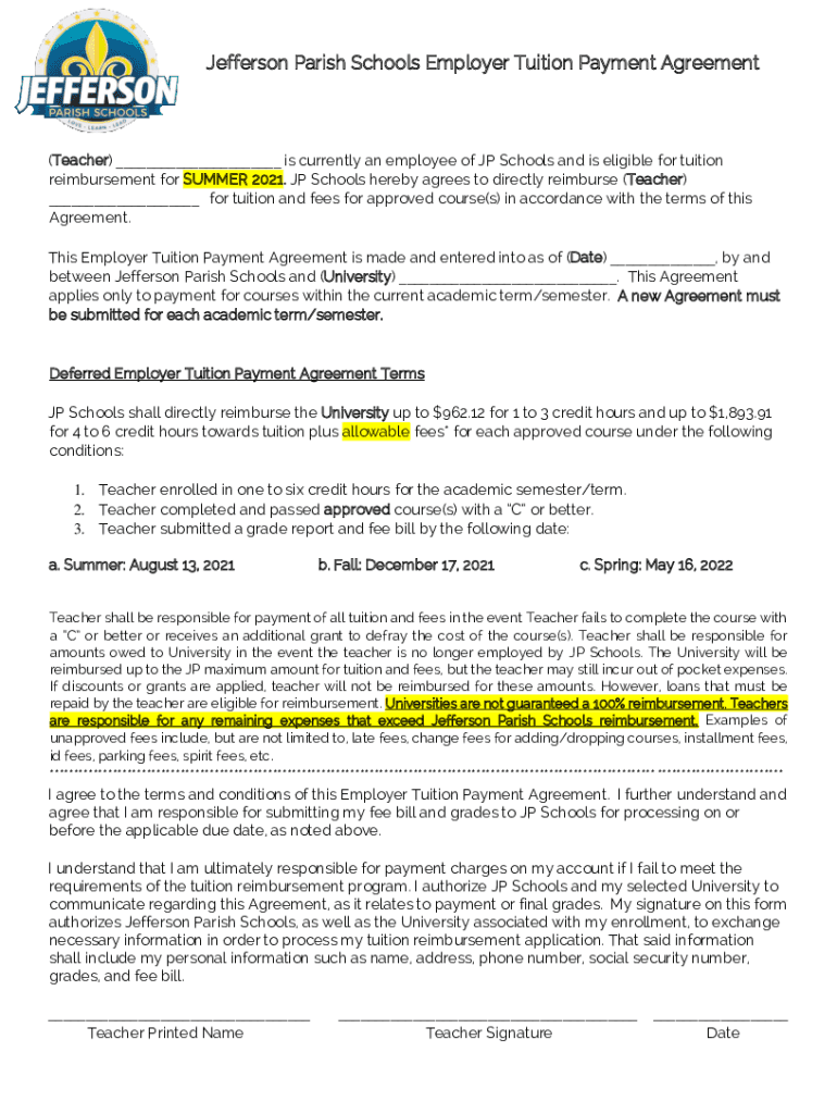 Jefferson Parish Schools Employer Tuition Payment Agreement(Teacher) ___ is currently an employee of JP Schools and is eligible for tuition reimbursement for SUMMER 2021. JP Schools hereby agrees