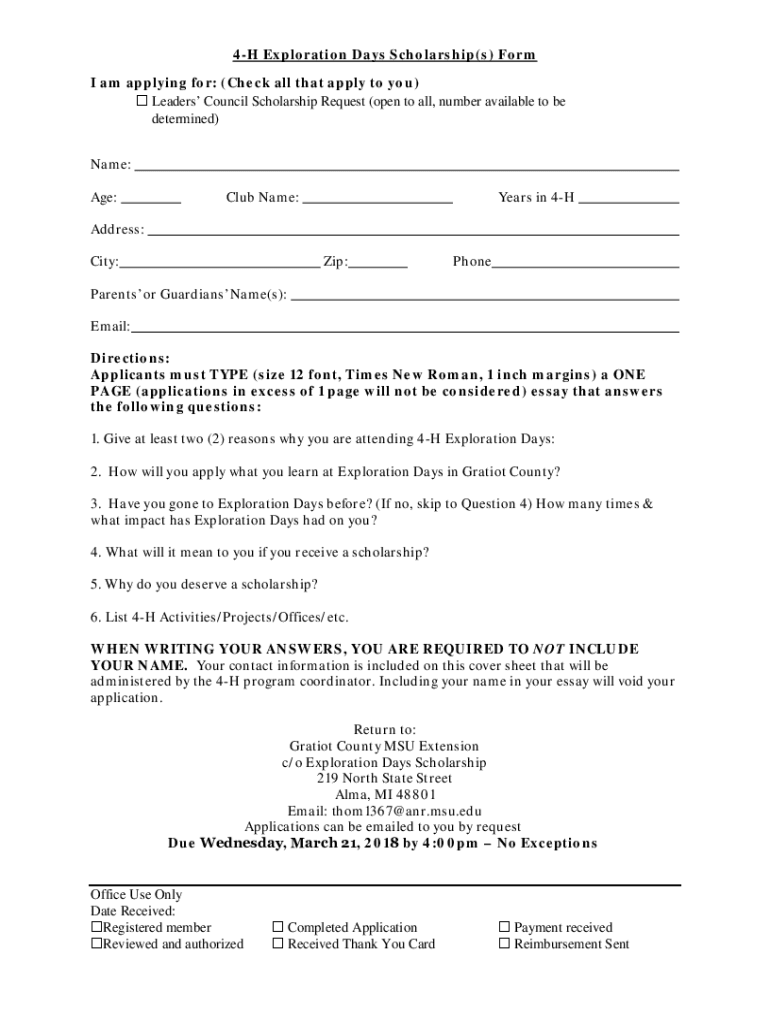 Due March 21, 2018, at the MSU Extension Office by 4:00 pm NO LATE OR INCOMPLETE ENTRIES WILL BE ACCEPTED. Ratio County Exploration Days Scholarship(s) Form The Ratio County MSU Extension 4H Program,