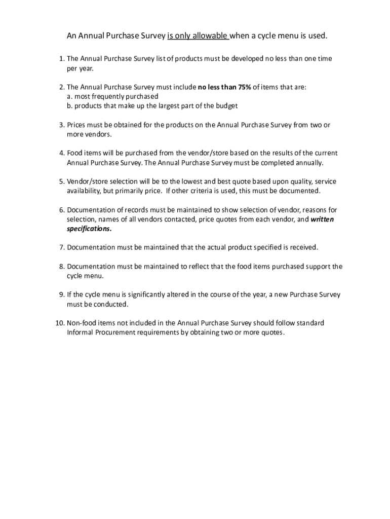 An Annual Purchase Survey is only allowable when a cycle menu is used.1. The Annual Purchase Survey list of products must be developed no less than one time per year.2. The Annual Purchase Survey