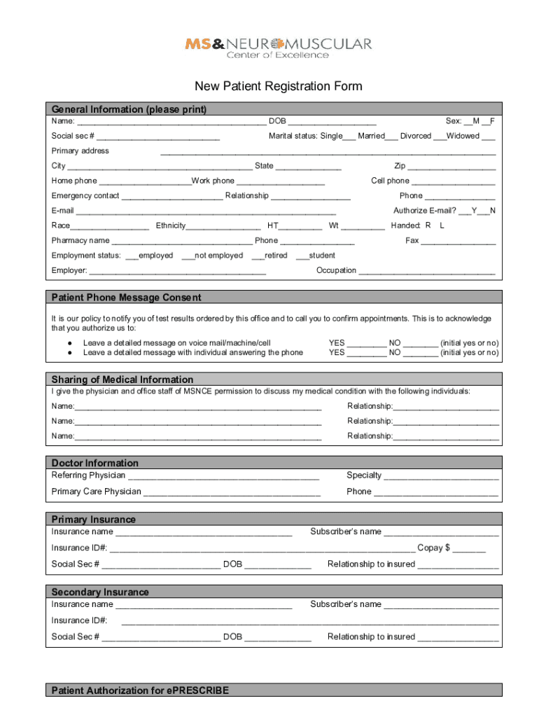 NewPatientRegistrationForm GeneralInformation(please print) Name:___DOB___ Social sec#___ PrimaryaddressSex:__M__FMaritalstatus:Single___Married___Divorced___Widowed______City___State___Zip___Homephone___Workphone___Cellphone___Emergencycontact___Relationship___