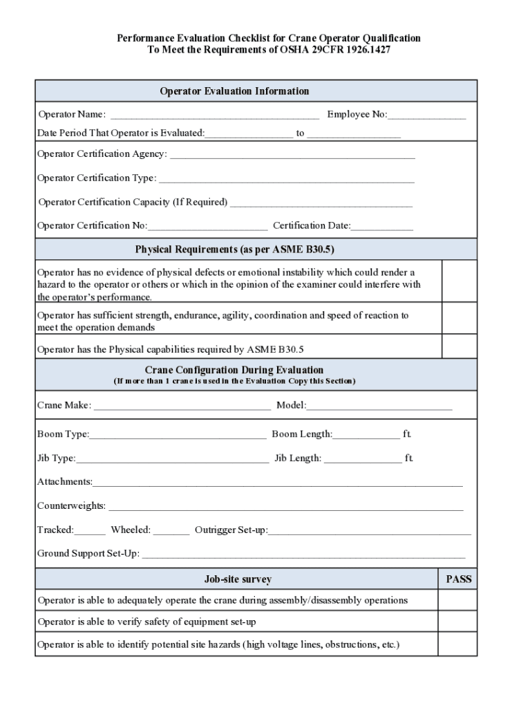 Performance Evaluation Checklist for Crane Operator Qualification To Meet the Requirements of OSHA 29CFR 1926.1427Operator Evaluation Information Operator Name: ___ Employee No:___ Date Period That