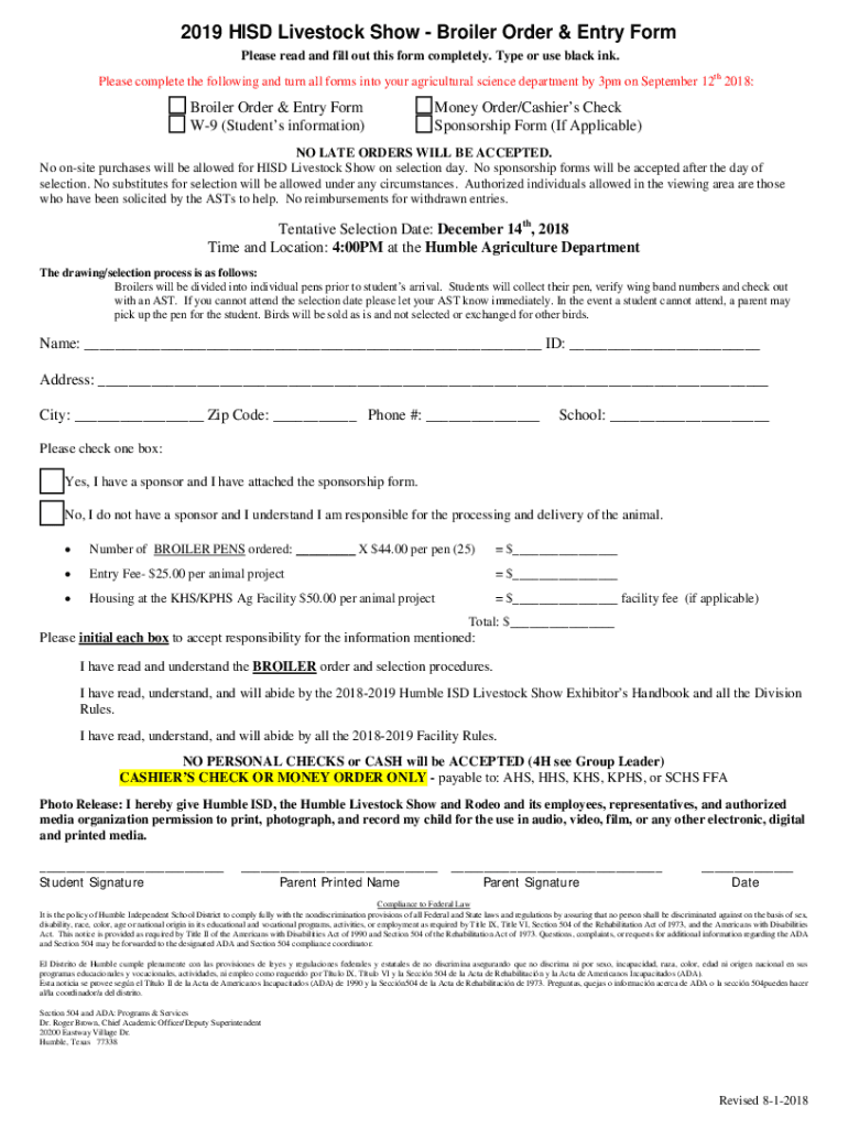 2019 HIS Livestock Show Broiler Order & Entry Form Please read and fill out this form completely. Type or use black ink. Please complete the following and turn all forms into your agricultural science