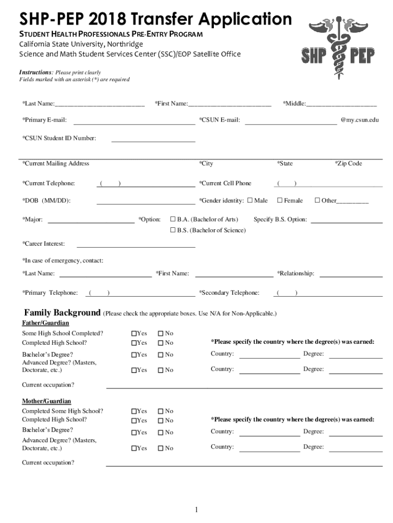 SHP PEP 2018 Transfer Application STUDENT HEALTH PROFESSIONALS REENTRY PROGRAM California State University, Northridge Science and Math Student Services Center (SSC)/TOP Satellite Office Instructions: