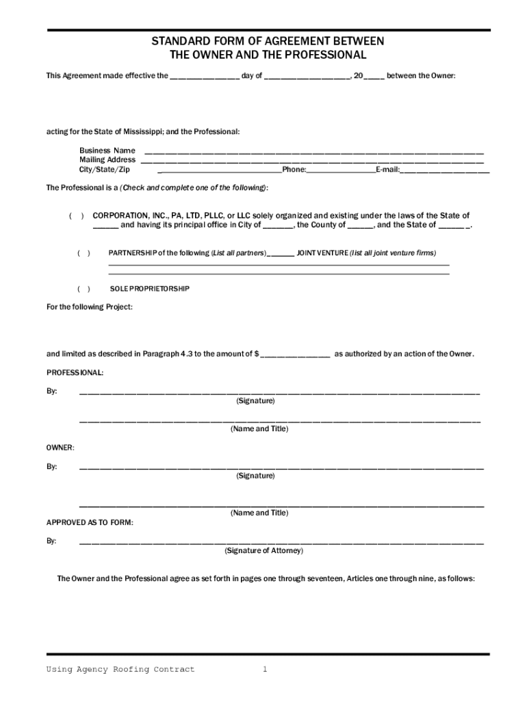 STANDARD FORM OF AGREEMENT BETWEEN THE OWNER AND THE PROFESSIONAL This Agreement made effective the ___ day of ___, 20 ___ between the Owner:acting for the State of Mississippi; and the Professional: