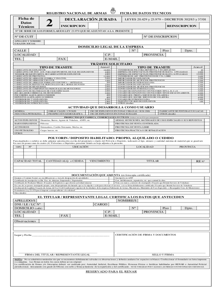 REGISTRY NATIONAL DE ARMASFicha de Dates Tcnicos2FICHA DE DATES TECNICOSDECLARACIN JURADALEYES 20.429 y 23.979 SECRETS 302/83 y 37/01INSCRIPCIONREINSCRIPCIONN DE SERIES DE LOS FORMULARIES LED 23.979