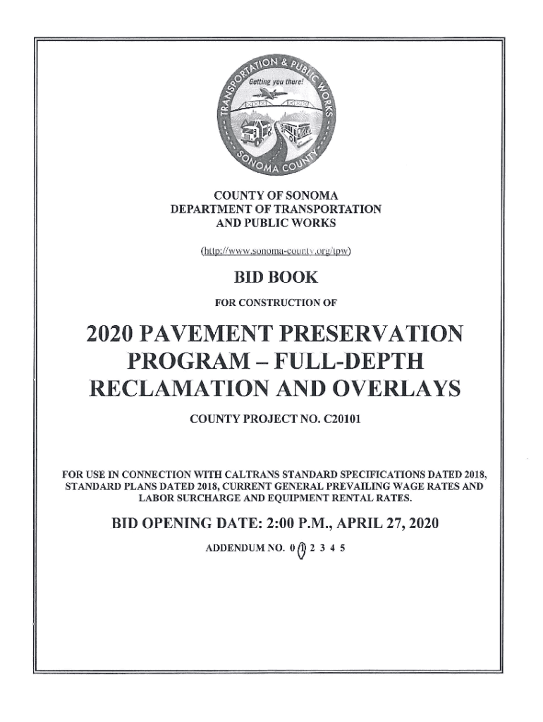 COUNTY OF SONOMA DEPARTMENT OF TRANSPORTATION AND PUBLIC WORKS (h TTP ://www.so tomato u NT v.org/TP, v)BID BOOK FOR CONSTRUCTION OF2020 PAVEMENT PRESERVATIONPROGRAM The FULLEST RECLAMATION AND OVERLAYS