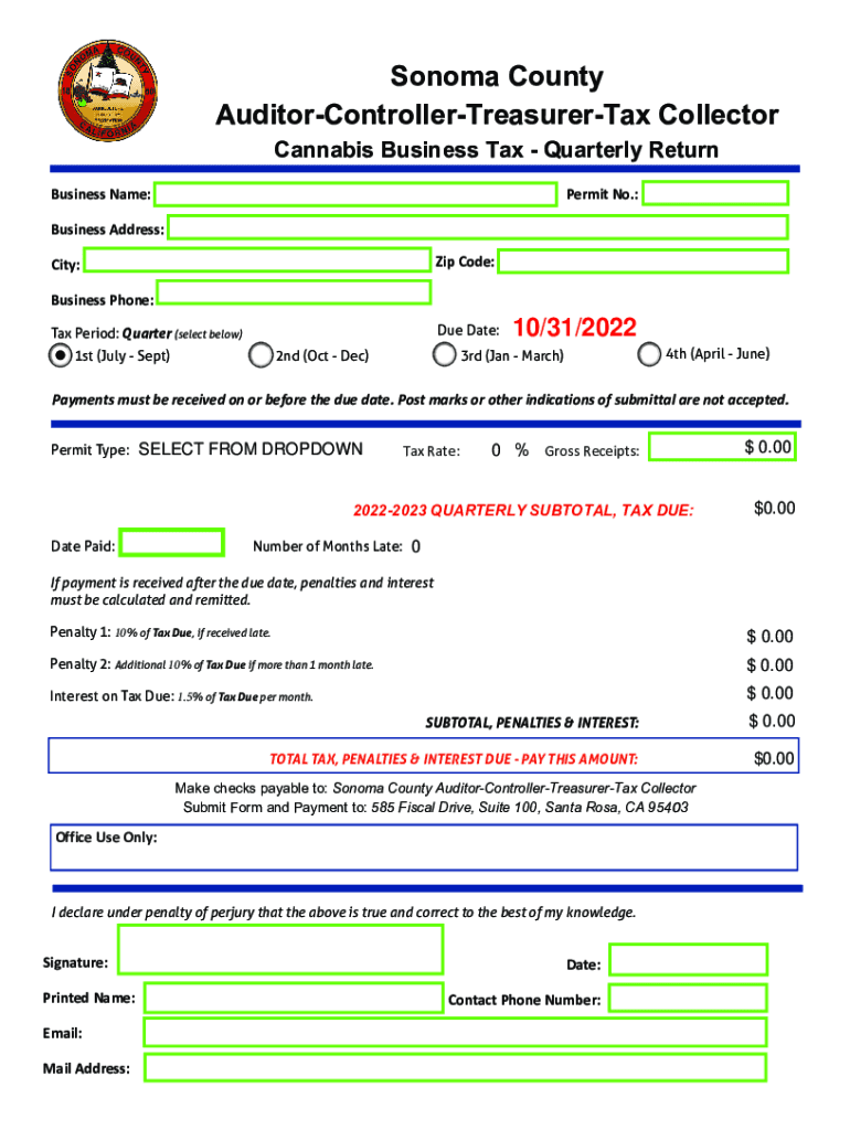 Sonoma County AuditorControllerTreasurerTax Collector Cannabis Business Tax Quarterly ReturnBusiness Name:Permit No.:Business Address: Zip Code:City: Business Phone:Due Date:Tax Period: Quarter (select