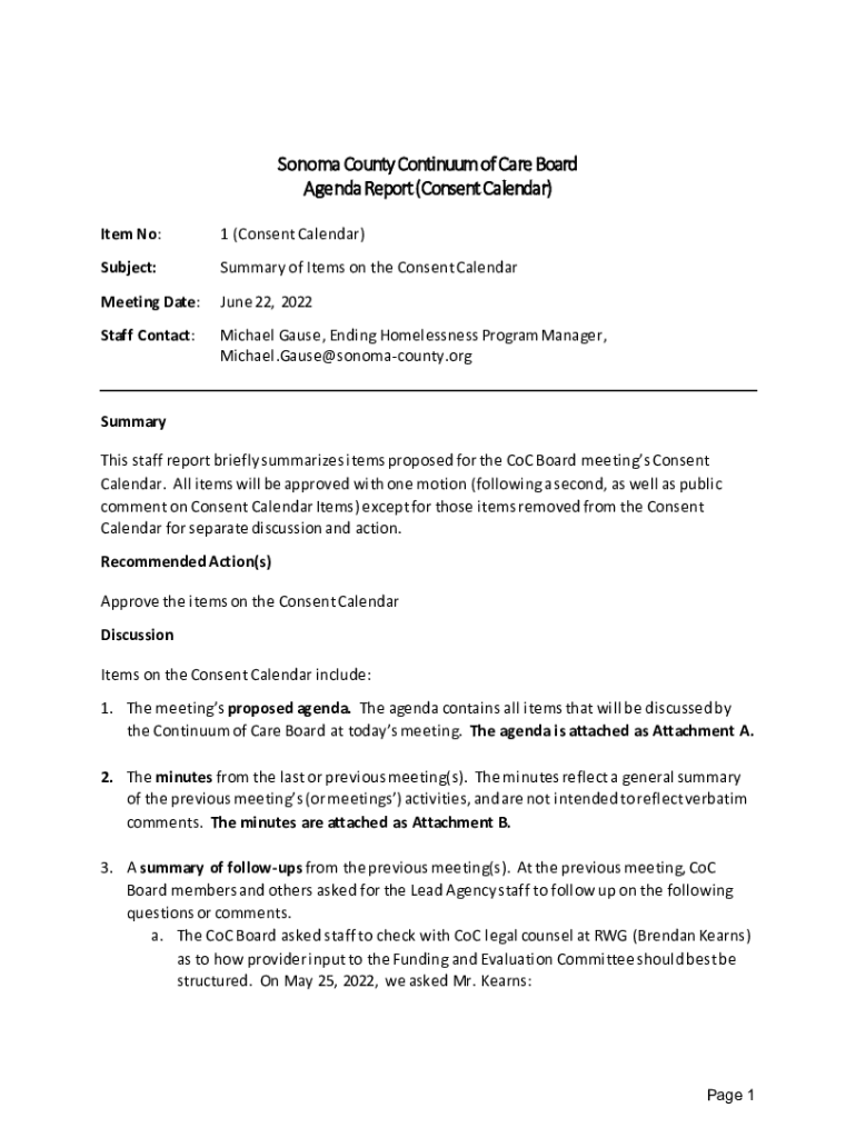 Sonoma County ContinuumofCare Board AgendaReport (Consent Calendar) Item No:1 (Consent Calendar)Subject:Summary of Items on the Consent CalendarMeeting Date:June 22, 2022Staff Contact:Michael Cause,