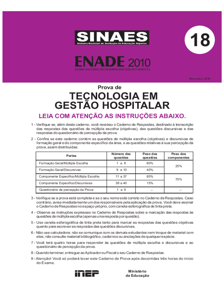 SINAES18Sistema Nacional de Avaliao the Educator Superior2010EXAME NATIONAL DE DESEMPENHO DOS ESTUDANTESNovembro / 2010Prova deTECNOLOGIA EM