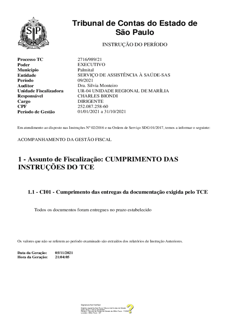 Tribunal de Contas do Est ado de So Paulo INSTR UO DO PERIOD Process TC Power Municipal Enfilade Period Auditor Unicode Fiscalizadora Response Cargo CPF Period de Gesto2716/989/21 EXECUTIVE Palm ital