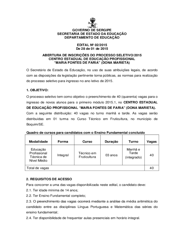GOVERN ODE SERVICE SECRETARIAT DE ESTATE DA EDUC AO DEPARTMENT DE EDUC AO EDIT AL N 02/2015 DE 28 DE 01 DE 2015 APERTURE DE INSCRIBES DO PROCESS SELECTIVE/2015 CENTR GRADUAL DE EDUC AO PROFESSIONAL