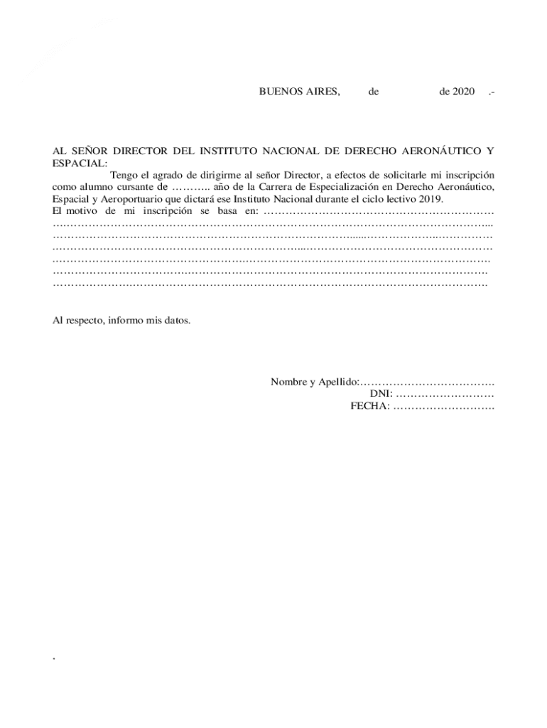 1BUENOS AIRES, deed 2020.AL SEER DIRECTOR DEL INSTITUTE NATIONAL DE JERICHO AERONAUTICS YE SPACIAL: Tango El grade DE dirigible all seer Director, an effect DE solicitor me inscription Como alumni