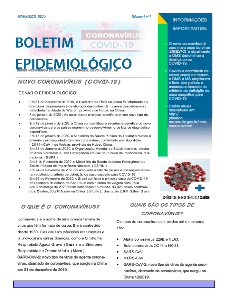 09/03/2020; 08:25Volumen 1, n 1INFORMAES IMPORTANT ES: O Nova coronavirus UMA nova CEPA do virus (SARSCoV2) e atualmente an OMS denominator a Donna Como COVID-19. Devi does a Florencia deSUPERINTENDNCIA