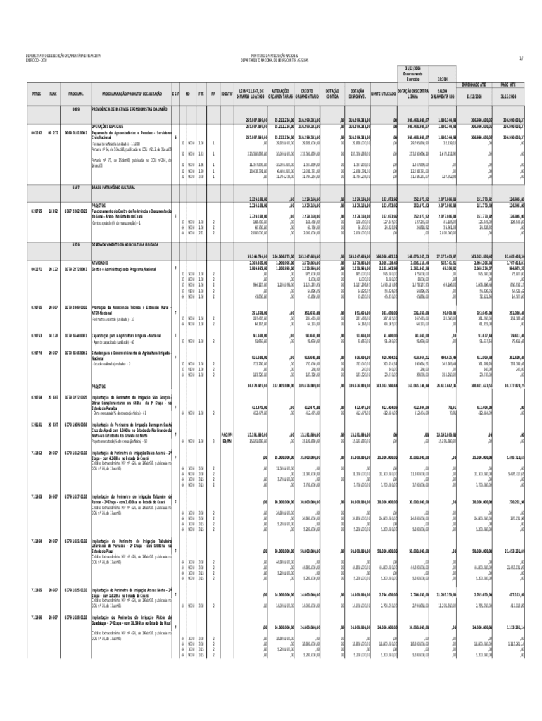 DEMONSTRATIVE DE EXE CUO ORAMENTRIA E FINANCE IRA EXERCISE 2008PTRESFUNCPROGRAM. 008900124209 2720089 0181 0001MINISTRIO DA INTEGRAL NATIONAL DEPARTMENT NATIONAL DE BRAS CONTRA AS SECASPROGRAMA/AO/PRODUCE/