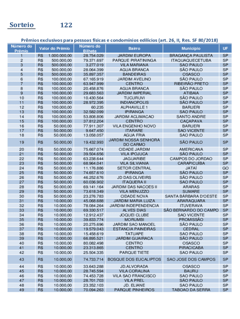 Sorteio122Prmios exclusives para persons physical e condemning edition (art. 26, II, Res. SF 80/2018) Nero do Prior 1 2 3 4 5 6 7 8 9 10 11 12 13 14 15 16 17 18R$ RJ RJ R$1.000.000,00 500,000.00 500,000.00