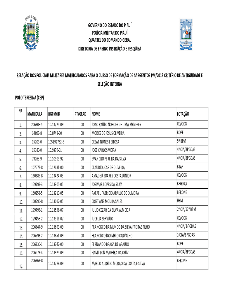 GOVERNOR DO ESTATE DO IAU POL CIA MILITARY DO IAU QUARTER DO COMMANDO GERALD DIRECTORIAL DE ENSI NO INSTR UO E PESQUISARELAO DOS POLICIES MILITATES MATRICULATES PARA O CURS ODE FORMAT DE SARGENT PM/2018