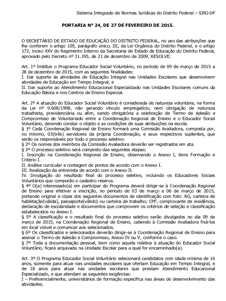 System Integral de Normas Juridical do Distrito Federal SINDH PORT ARIA N 24, DE 27 DE FEDERICO DE 2015. O SECRET RIO DE ESTATE DE EDUC AO DO DISTRITO FEDERAL, no USO was attributes Que the confirmation