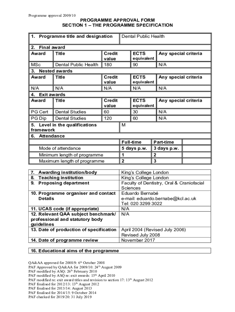 Program approval 2009/10PROGRAMME APPROVAL FORM SECTION 1 THE Program SPECIFICATION 1. Program title and designation 2. Final award Title M.Sc. Dental Public Health 3. Nested awards Award Title N/A