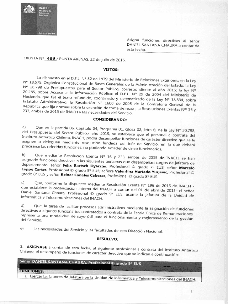 INCH Minister de Relaciones ExterioresGobierno de ChileAsigna functions directives all seer DANIEL SANTANA CHAKRA a contra de ESTA tech. EVENT N489/ PUNTA ARENAS, 22 de Julio de 2015.VISTAS: Lo dispute