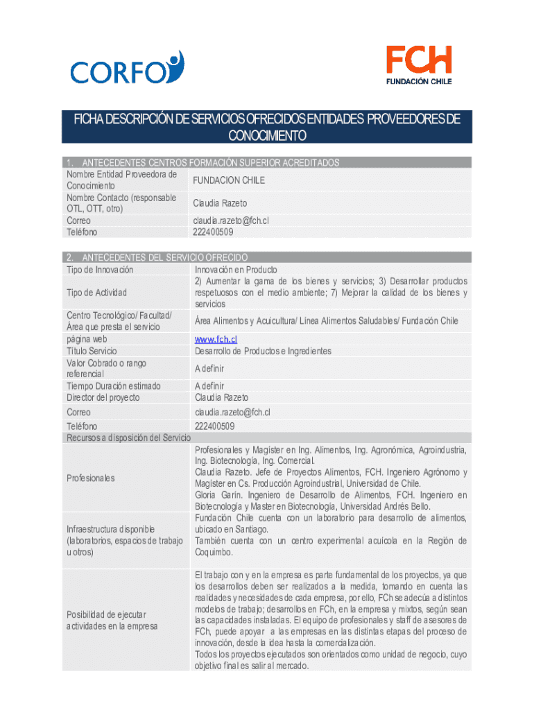 FICA DESCRIPTION DE SERVICES OFRECIDOS ENFILADES PROCEDURES DE CONOCIMIENTO 1. ANTECEDENTS CENT ROS FORMALIN SUPERIOR ACREDITADOS Hombre Enticed Provender de FUNDACION CHILE Conocimiento Hombre Contact