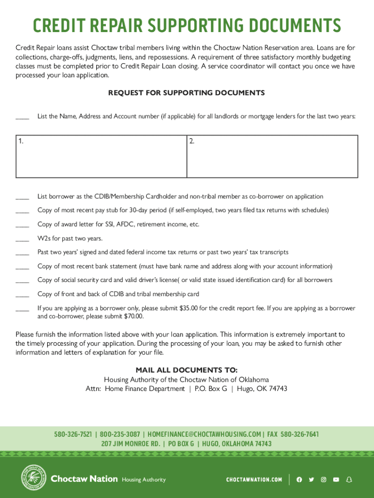 CREDIT REPAIR SUPPORTING DOCUMENTS Credit Repair loans assist Choctaw tribal members living within the Choctaw Nation Reservation area. Loans are for collections, charge offs, judgments, liens, and
