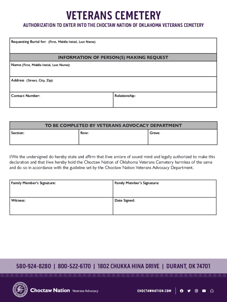 VETERANS CEMETERYAUTHORIZATION TO ENTER INTO THE CHOCTAW NATION OF OKLAHOMA VETERANS CEMETERY Requesting Burial for: (First, Middle Initial, Last Name)INFORMATION OF PERSON(S) MAKING REQUEST Name