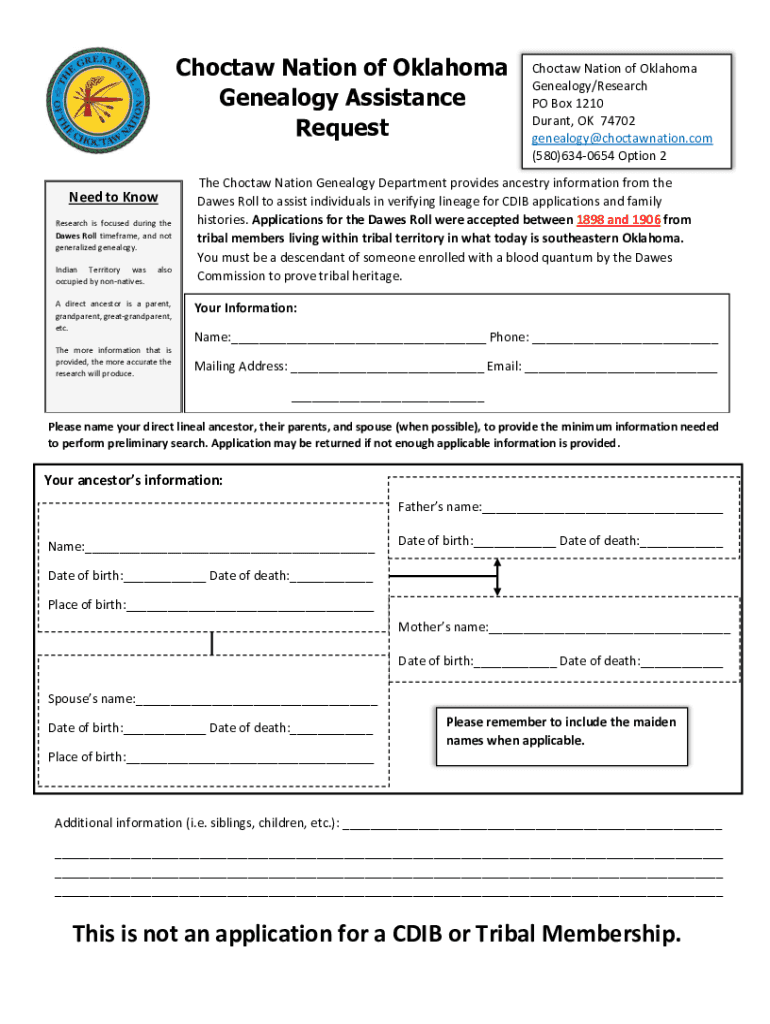 Choctaw Nation of Oklahoma Genealogy Assistance Request Need to Know Research is focused during the Dawes Roll timeframe, and not generalized genealogy. Indian Territory was occupied by nonnatives.