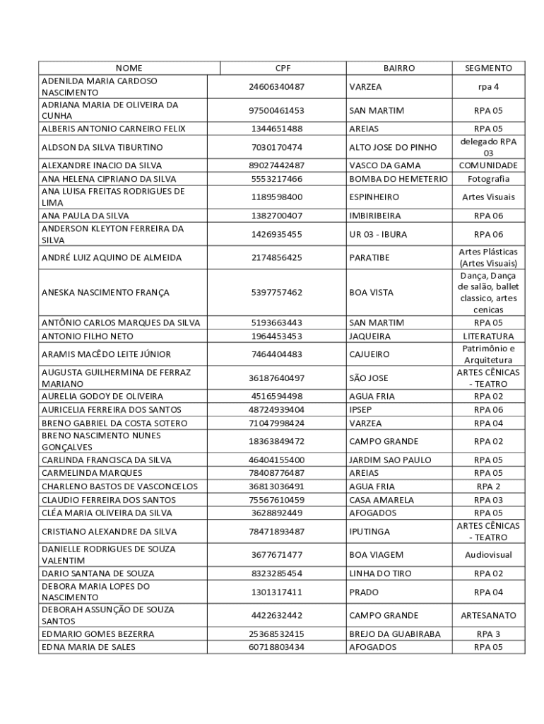 nome cpf bairro segmento é um conjunto de informações que identifica uma pessoa física e seu local de residência, bem como seu segmento de atuação ou área de interesse.