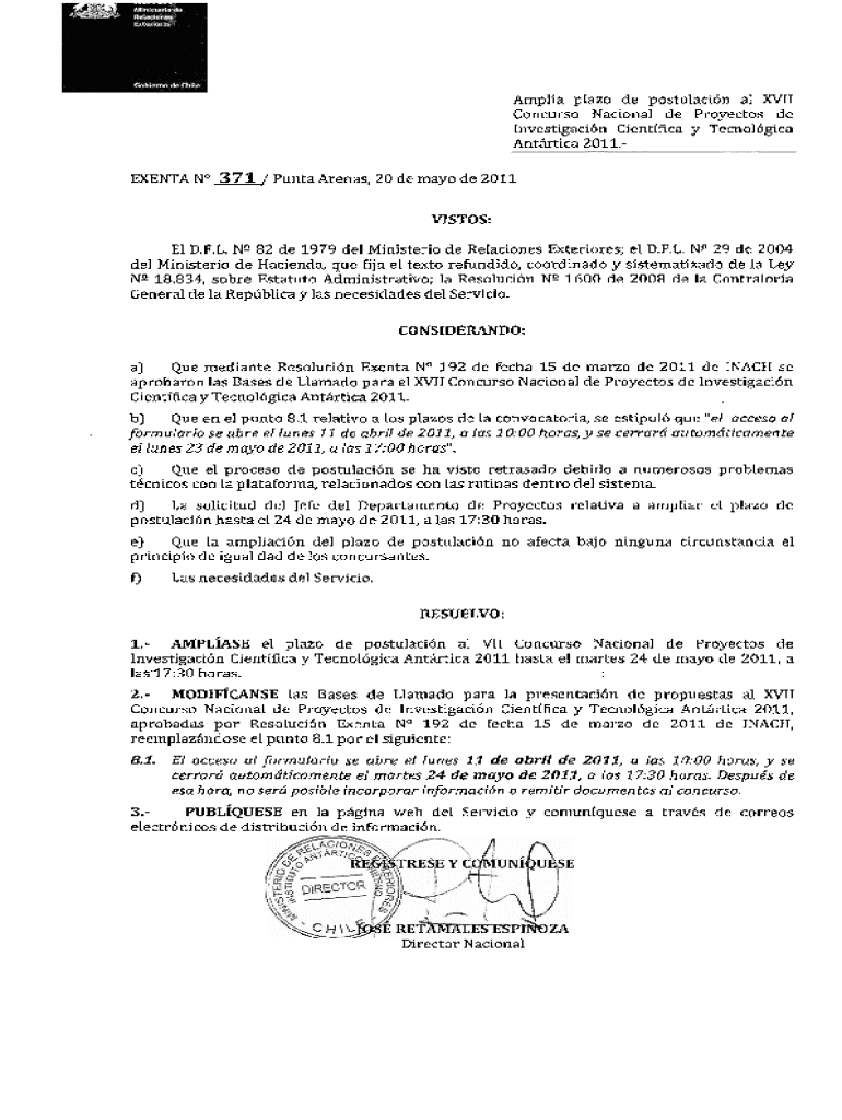 Amelia plaza DE postulating all XVII Concurs Nacional de Proyectos de Investigacin Scientific y Technological Antarctica 2011.EVENT No 371 / Punta Arenas, 20 DE may ode 2011 VISTAS:El D.F.L. NQ82