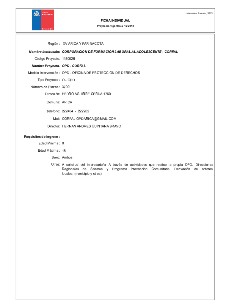 Circles, 9 Nero, 2013FICHA INDIVIDUAL Projects Vicente a 12 2012Regin : XV ARICA Y PARINACOTA Hombre Institution: CORPORACIÓN DE FORMATION LABOR AL ADOLESCENT CORFALCdigo Project: 1150026 Hombre