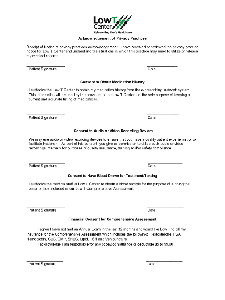 Acknowledgement of Privacy Practices Receipt of Notice of privacy practices acknowledgement: I have received or reviewed the privacy practice notice for Low T Center and understand the situations