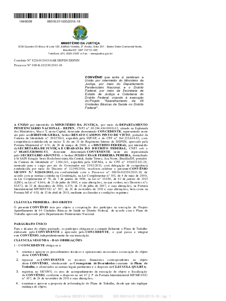 164600808016.011530/201519MINISTRIO DA JUSTIN SCN Quadrat 03 Block B Love 120, Edifice Victoria, 2 Adar, Sale 201 Herero Sector Commercial North, Brasília/OF, CEP 70713 020 Telephone: (61) 2025 3987