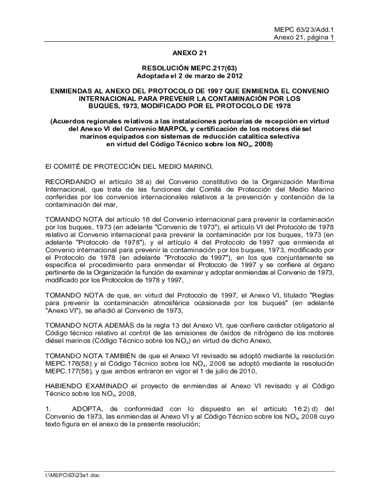 MEC 63/23/Add.1 Next 21, Gina 1 NEXT 21 RESOLUTION MEC.217(63) Adopted El 2 de Mario de 2012 ENCOMIENDAS AL NEXT DEL PROTOCOL ODE 1997 QUE ENCOMIENDA EL CONVENTION INTERNATIONAL PARA PREVENT LA CONTAMINATION