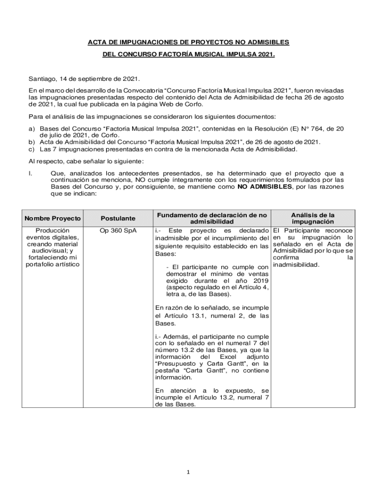Get the free ACTA DE IMPUGNACIONES DE PROYECTOS NO ADMISIBLES DEL CONCURSO ... - CORFO