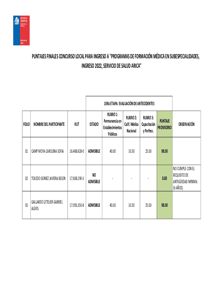 PENTANES FINALES CONCURS LOCAL PARA INGRESS A \” PROGRAMS DE FORMALIN MICA EN SUBESPECIALIDADES, INGRESS 2022, SERVICE DE SALAD ARICA1ERA ET APA: EVALUATION DE ANTECEDENTESFOLIO01NOMBRE DEL PARTICIPANTECAMP