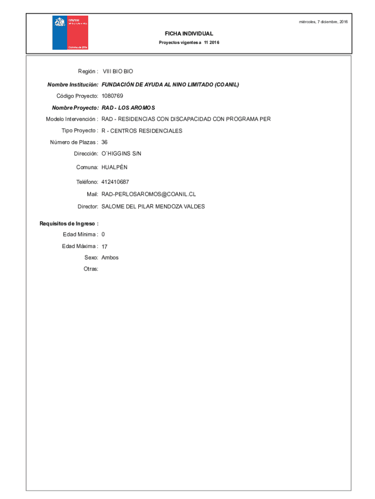 Circles, 7 December, 2016FICHA INDIVIDUAL Projects Vicente an 11 2016Regin : VIII BIO Hombre Institution: FOUNDATION DE AYU DA AL NIÑO LIMITED (COUNCIL)Cargo Project: 1080769 Hombre Project: RAD